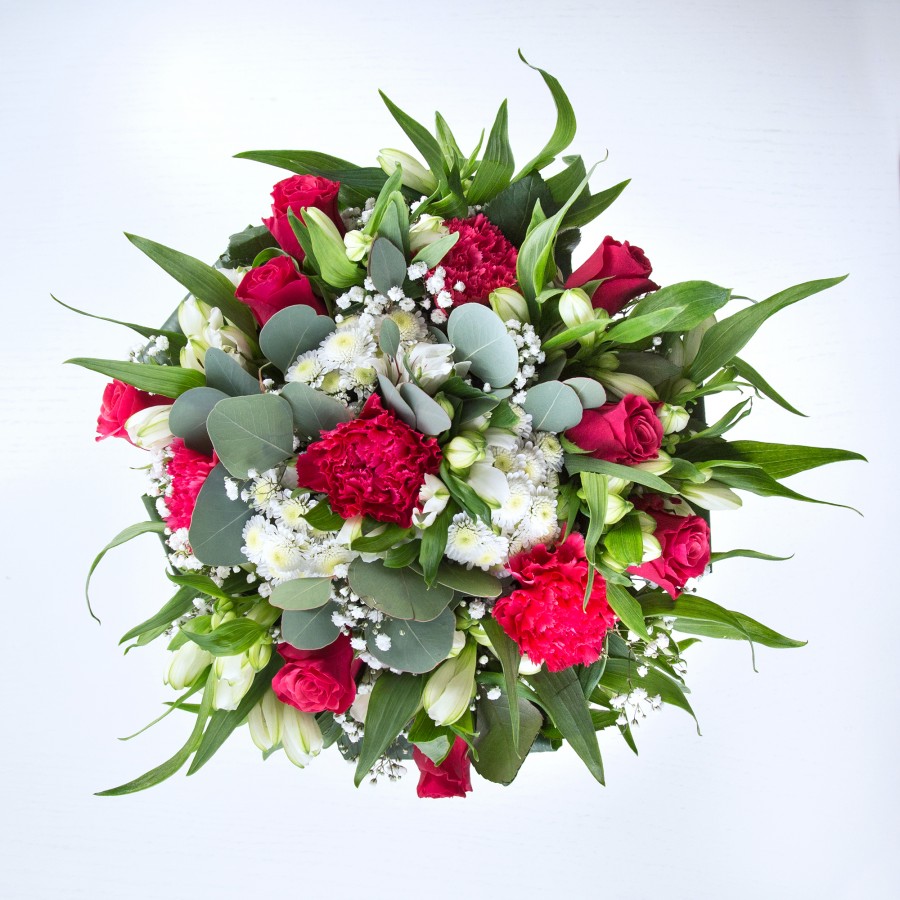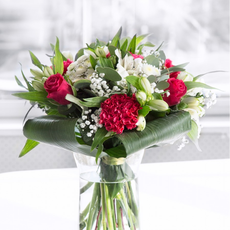 Discover the stunning beauty of our sophisticated bouquet. Showcasing deep red roses paired with elegant white chrysanthemums, delicate gypsophila, and charming carnations. The arrangement is beautifully accented with white alstroemeria and aspidistra leaves, creating a harmonious and eye-catching display.