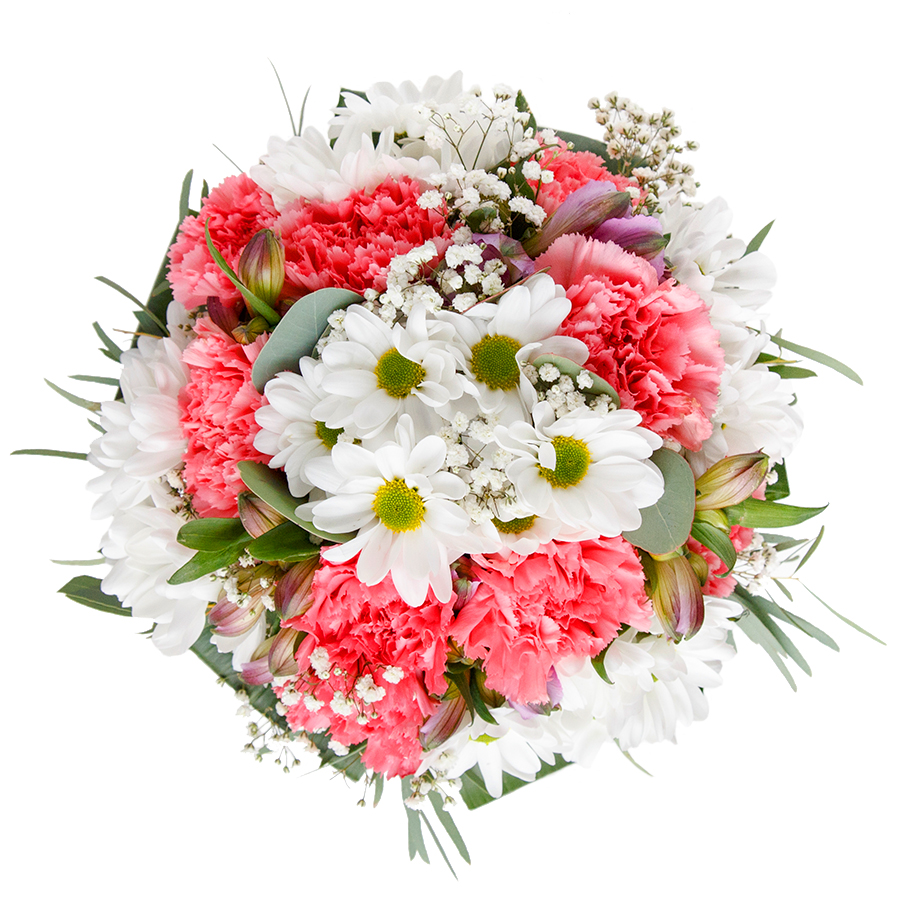 Present a bouquet that embodies timeless elegance with snow-white chrysanthemums, airy gypsophila, and soft pink carnations, all beautifully arranged with vibrant aspidistra leaves. Each flower is hand-picked to ensure lasting freshness and superior quality.